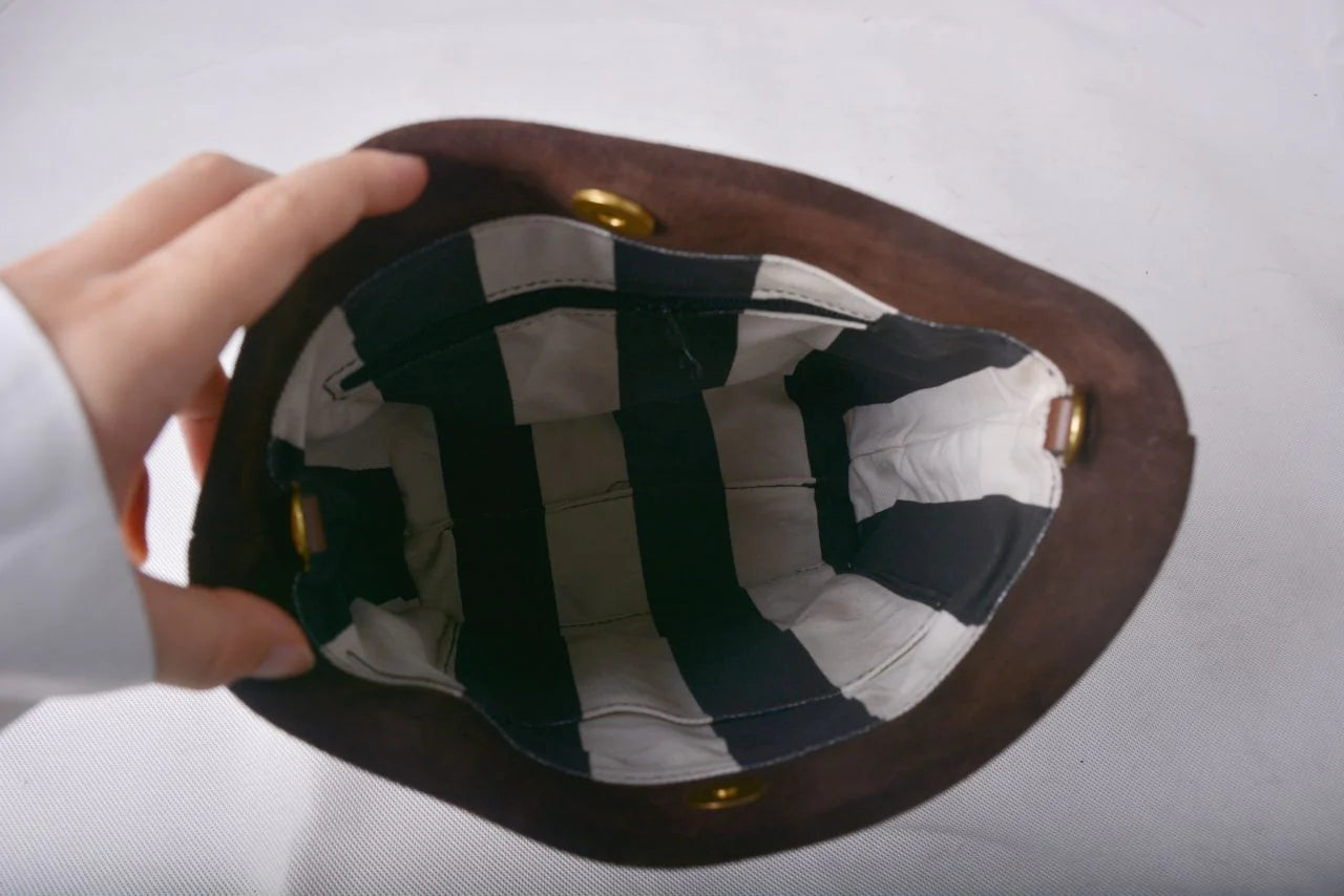 We love using real veg tanned leather in our handbags because they just better with age. If you happen to get scratches or water marks, you can usually get the bag looking new again with just a little maintenance. Please click here to read about how to care for your veg tanned leather.